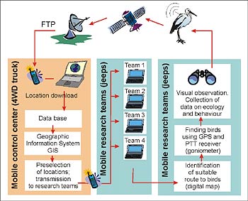 >> Satellitentelemetrie Satellitentelemetrie ist heute eine der Standardmethoden für die Erforschung von Langstrecken-Tierwanderungen. Sie liefert Koordinaten, die es ermöglichen, die Wanderrouten der Tiere nachzuvollziehen. Wir verfügen über langjährige Erfahrung in der Anwendung der Satellitentelemetrie. Dabei gehen wir einen Schritt weiter als die meisten anderen Projekte. Wir kombinieren die "traditionelle" Satellitentelemetrie mit weiterführenden Methoden, um auf der Wanderroute zusätzliche Informationen zu Ökologie, Verhalten und Gefährdung der untersuchten Arten zu erheben. Die dazu erforderlichen Arbeitsabläufe wurden von uns optimiert und teilweise neu entwickelt. Techniken wie der Einsatz von PTT-Receivern (Goniometern) zur Lokalisierung von Satellitensendern vom Boden aus wurden von uns erstmalig eingesetzt. Unsere Leistungen für Ihre Projekte -